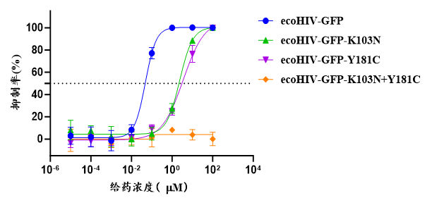 图3.奈韦拉平对不同ecoHIV-GFP耐药毒株的抑制率曲线